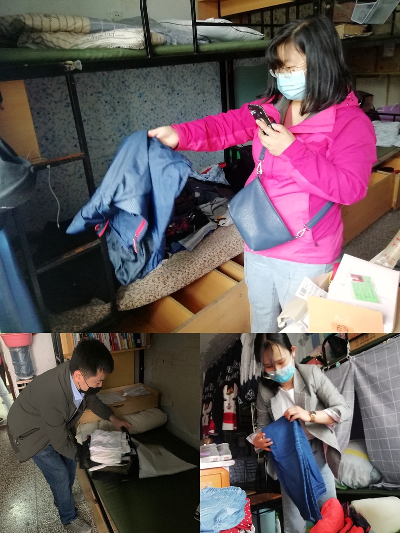 进入学生寝室需要向学校宿舍科申请,体温检测合格方可进入学生寝室内,取衣物时,为了提高效率,几位老师采用与学生实时视频的方式获取学生衣物,并按照寝室班级将取得的衣物编号,以便邮寄时好区分。