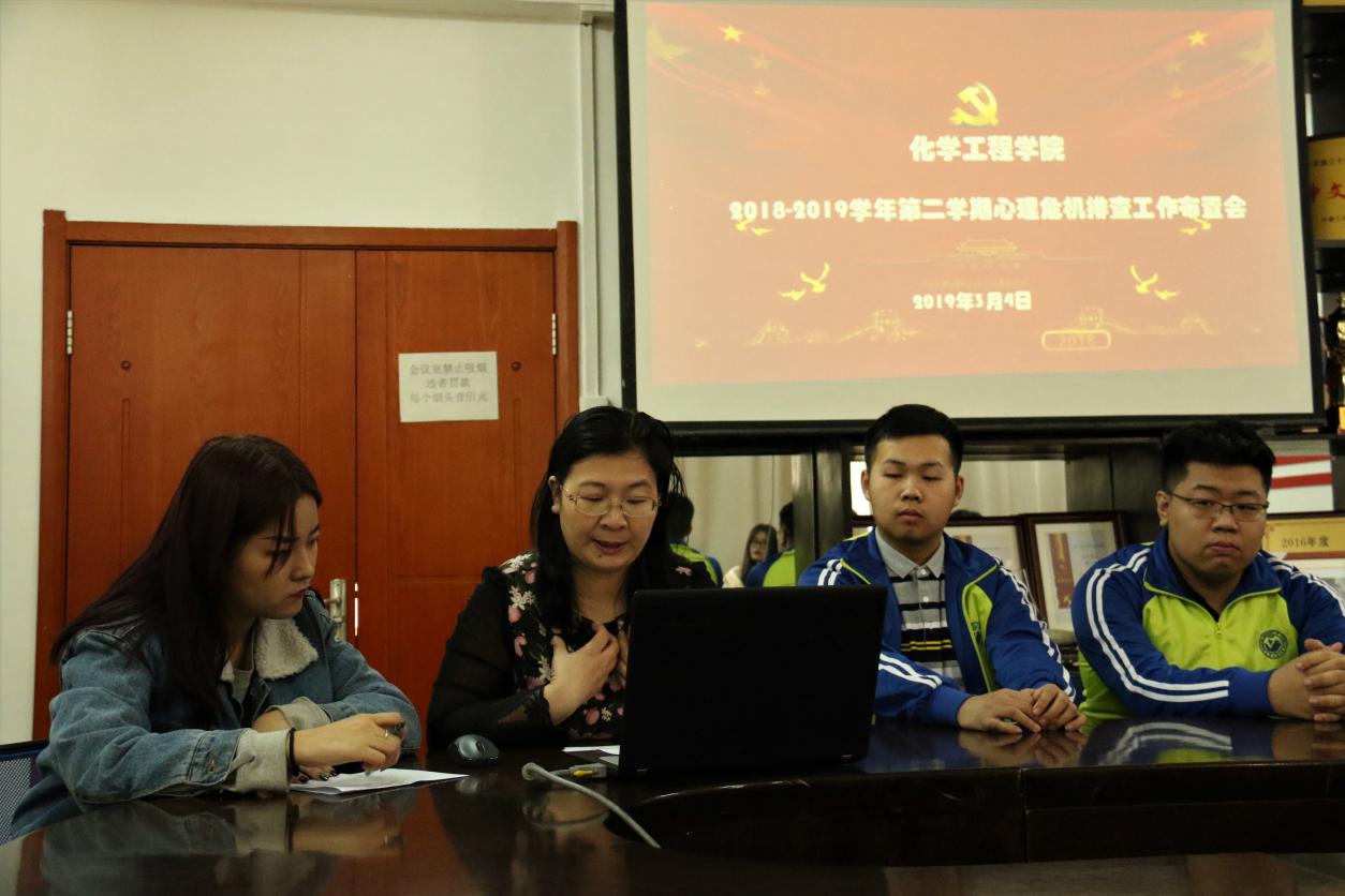 2018-2019学年第二学期心理危机排查工作布置会于近日在化工楼会议室召开。会议由学院心理辅导员肖芳老师主持,各班心理委员参加了会议。