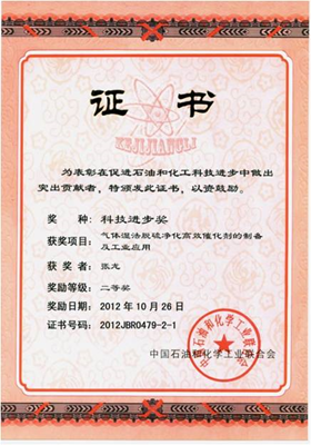 以γ-Al2O3为载体,先通过浸渍法将金属硝酸盐负载在载体上,然后对其焙烧实现了碱性金属氧化物在载体γ-Al2O3上的负载,由此制成碱性催化剂载体,再以添加了季铵盐或有机碱的磺化酞菁钴乙醇水混合溶液为浸渍液,对上述载体进行浸渍后干燥制得目标催化剂。该催化剂主要适用于液化石油气、汽油、煤油、石脑油、航空燃料、液体丙烯及其它液态石油组分的脱硫醇。实验表明20 min硫醇转化率可达100%,催化剂寿命超过300小时。目前以实现百吨催化剂生产装置的建设。成为全国脱硫催化剂名牌产品,获五项发明专利,科技进步二等奖和专利两部。